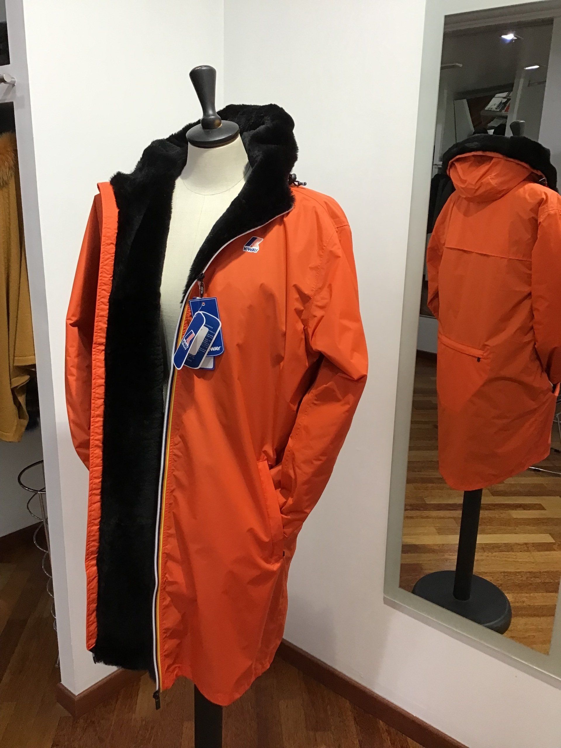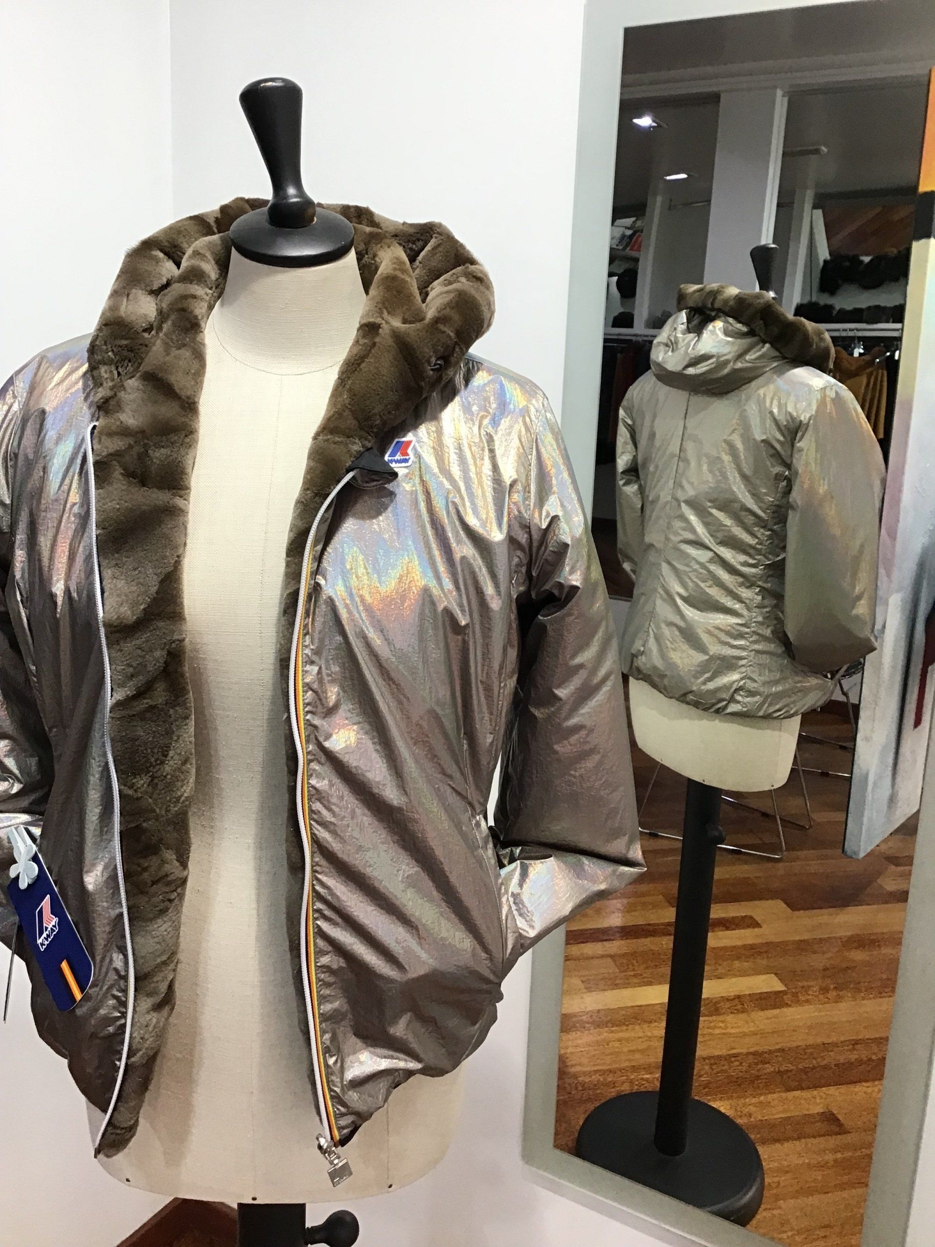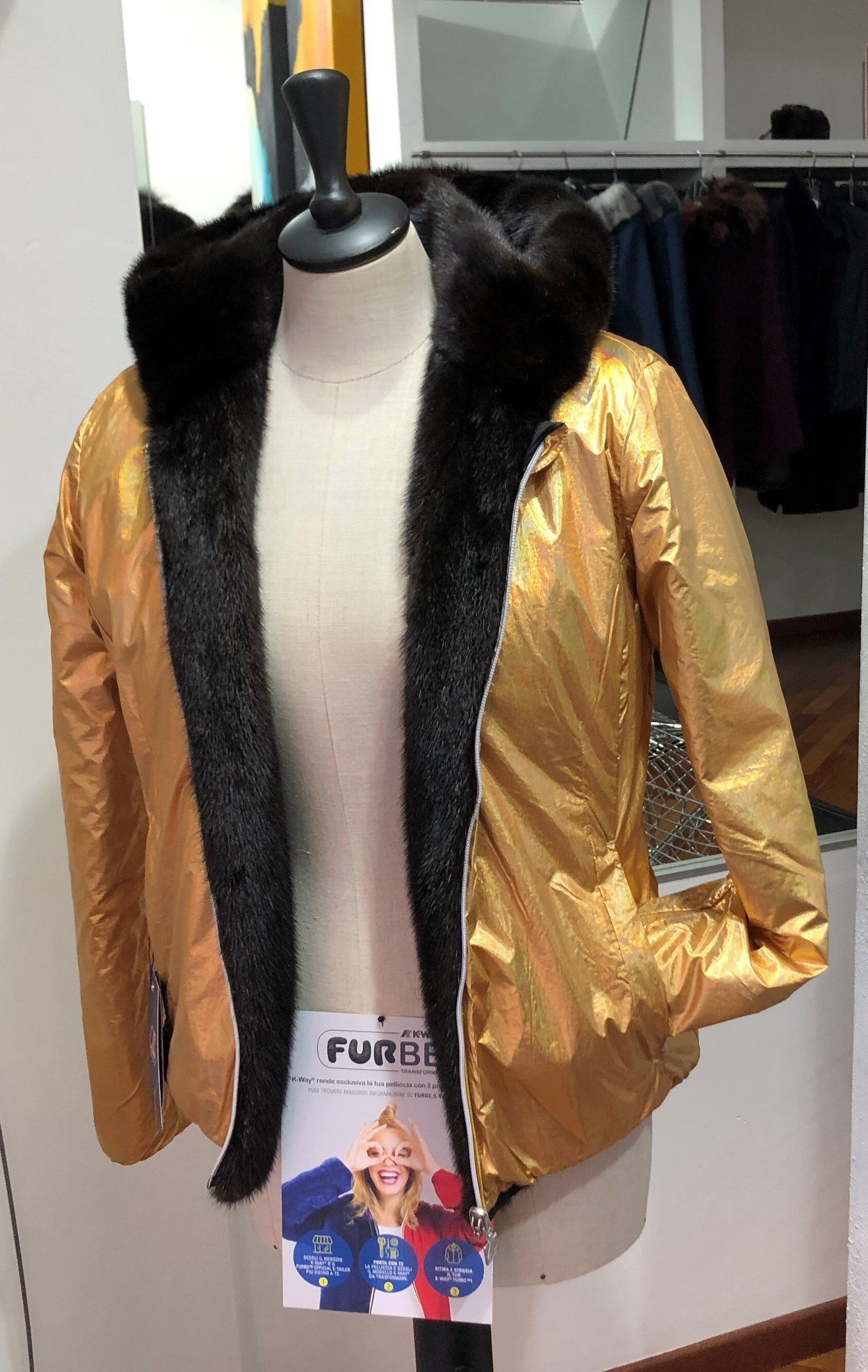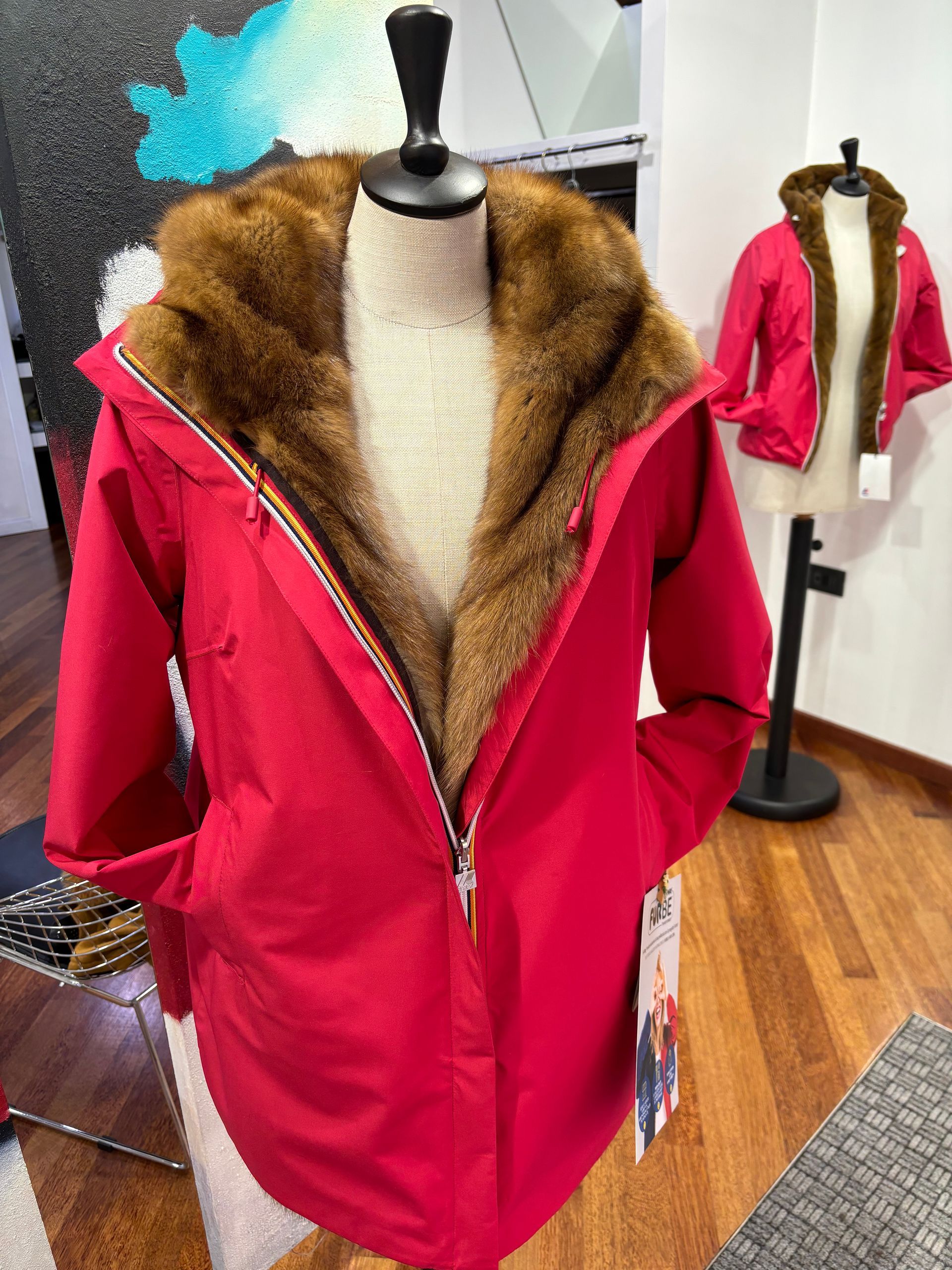 Offre la possibilità di trasformare la propria pelliccia in un nuovo capo K-Way non solo in tessuto tecnico ma anche in leggerissima e morbidissima nappa .